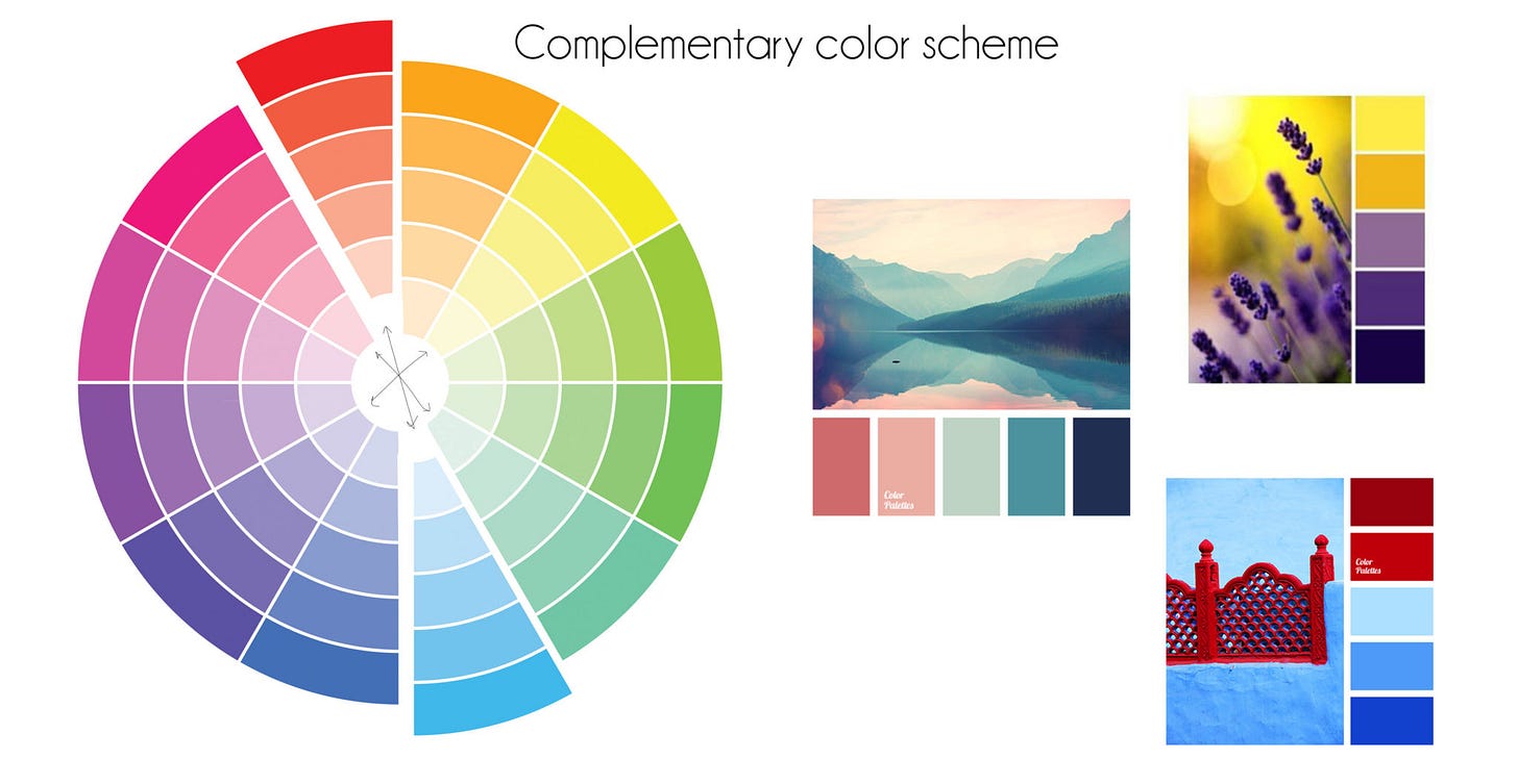 The easiest way to approach complmenetary colors is to look at a color wheel, like the one above. Let’s say you pick the color red. The complimentary counterpart to the color red would be blue.